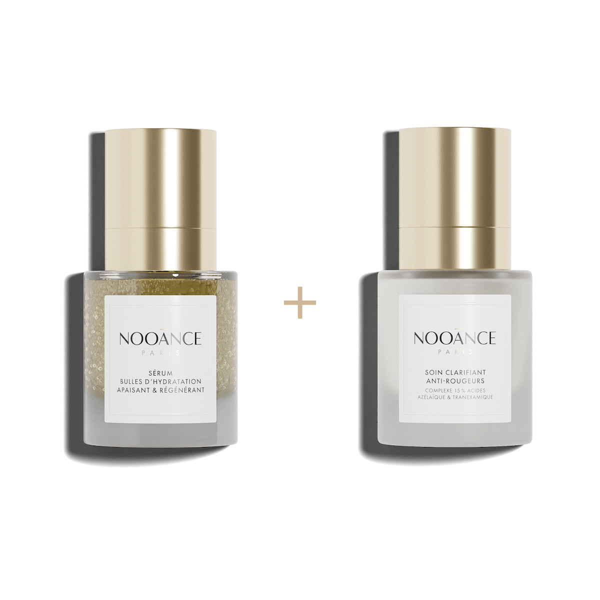 Discover our dynamic duo, a perfect synergy between our Hydration Bubbles Serum and our Clarifying Anti-Redness Care. Specially designed for sensitized skin prone to redness, this duo offers intense hydration, nourishes the skin, and creates a shield against external aggressions. With continuous use, expect a gradual reduction in redness and visibly brighter, firmer, and more unified skin.