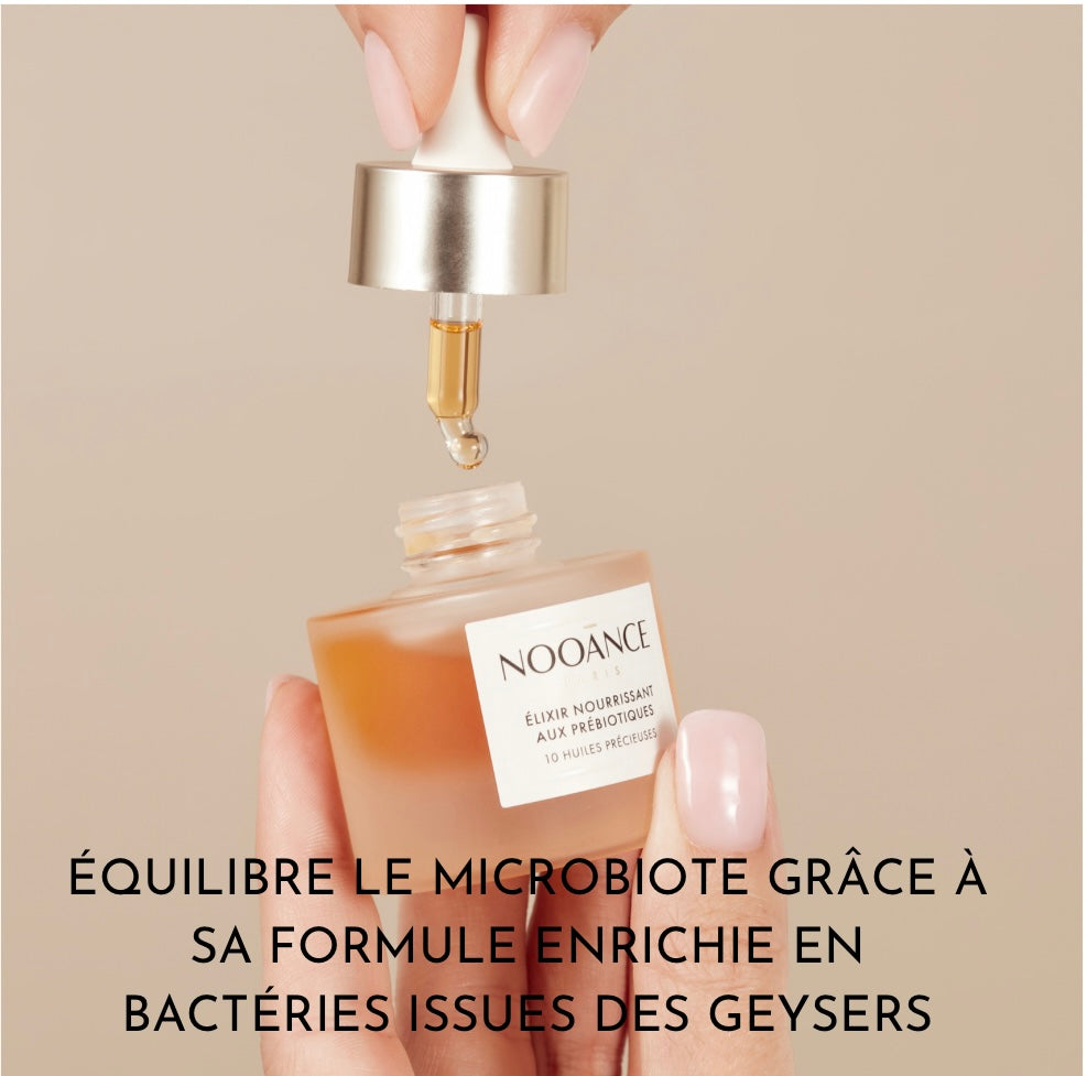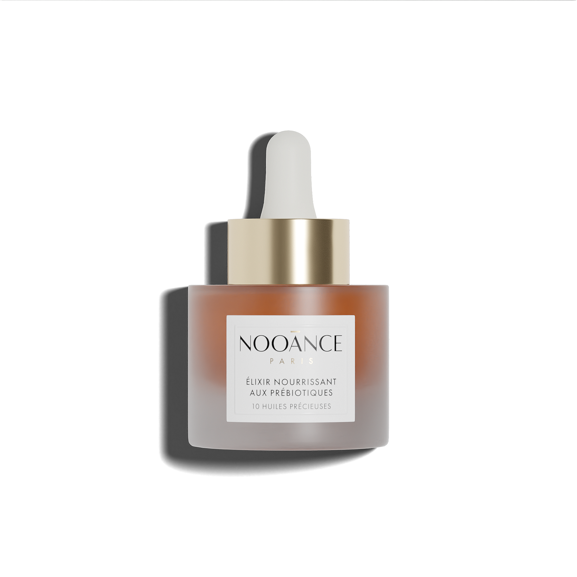 Our Elixir 10 precious oils with prebiotics offers a combination of natural and innovative ingredients to provide your skin with the care it needs. Formulated with a selection of vegetable oils chosen for their nutrient richness, (Jojoba, Cacay, prickly pear, Marula, Nigella, Hibiscus, Hazelnut, Safflower, Moringa, Cranberry oils) as well as an innovative biotechnological prebiotic, derived from rare extremophile bacteria extracted from geysers, this elixir nourishes, protects, and balances the skin, while strengthening its barrier. Your skin is soft and firm, your microbiome is healthy, your complexion is luminous.