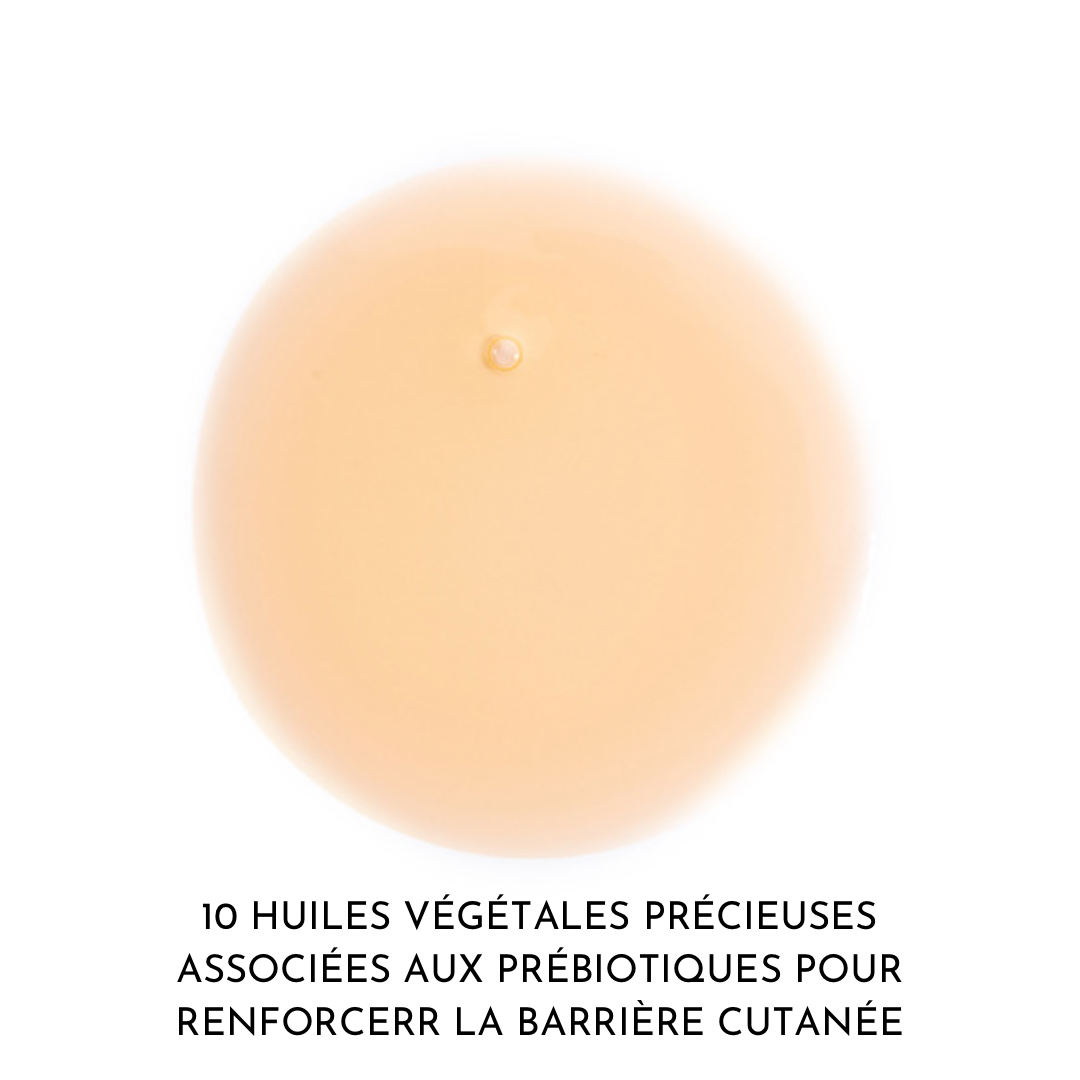 To strengthen the skin barrier, reduce irritation and protect the skin against aggression, this oil contains prebiotic lipids which also strengthen the skin microbiome.