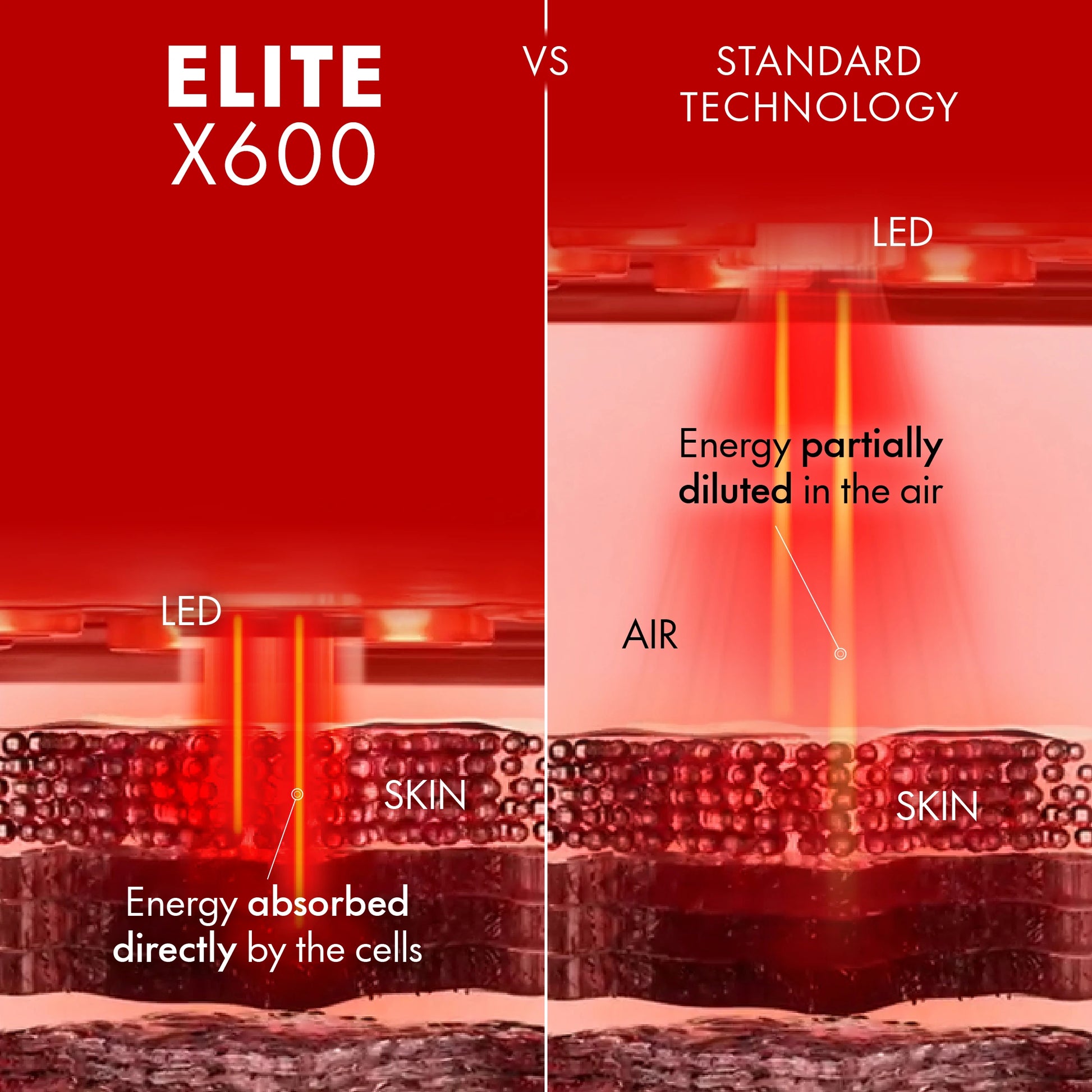 The power level (irradiance) is identical to that of "The Professional" mask: 50 mW/cm². However, thanks to its ultra-dense placement of 600 LEDs emitting light perpendicular to the skin, the Elite X600 mask emits more light with greater precision, more uniformly and over a larger surface area, for enhanced cellular stimulation and an effectiveness never before achieved with at home devices.