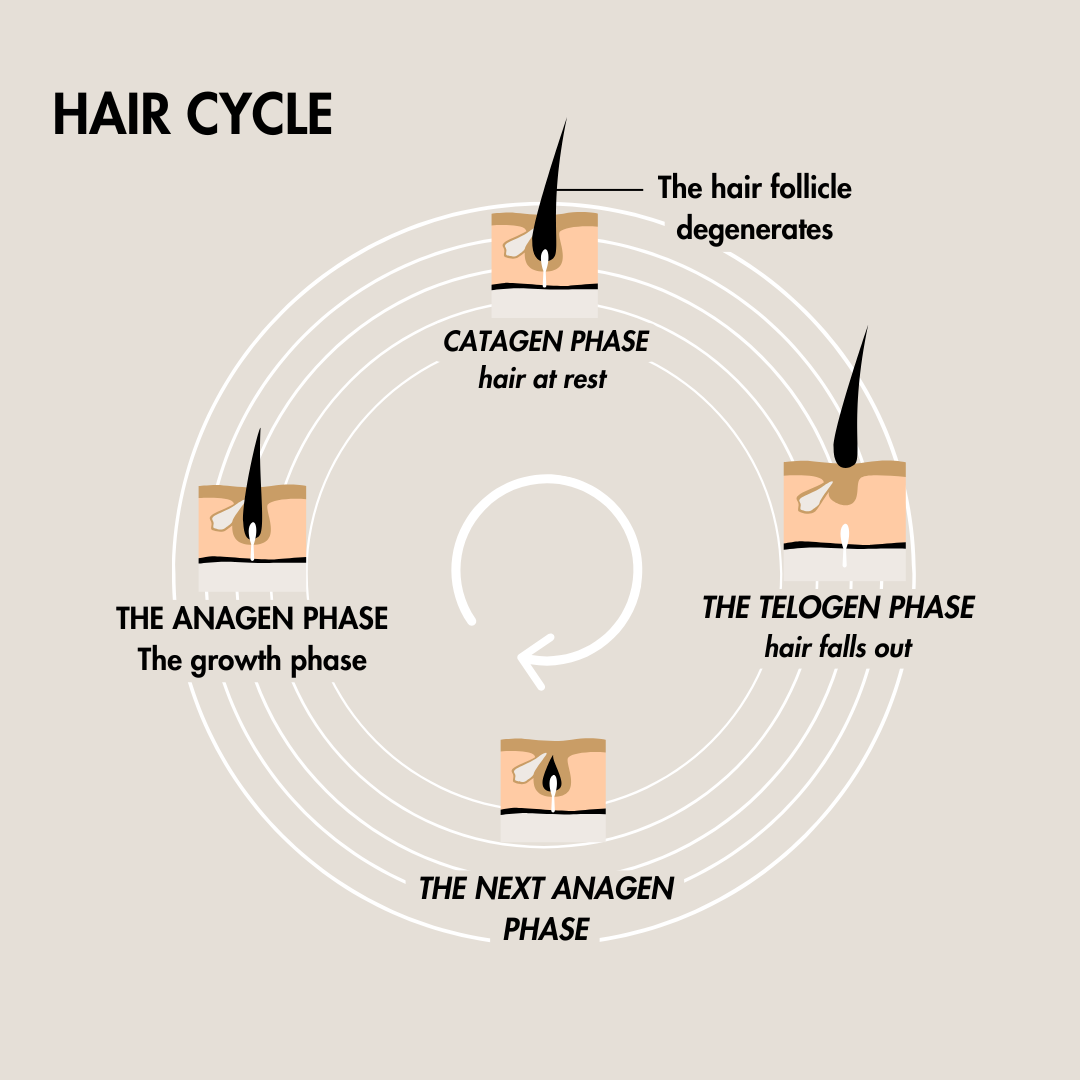 The life cycle of a hair includes three main phases: anagen, catagen, and telogen, which take place over several years.