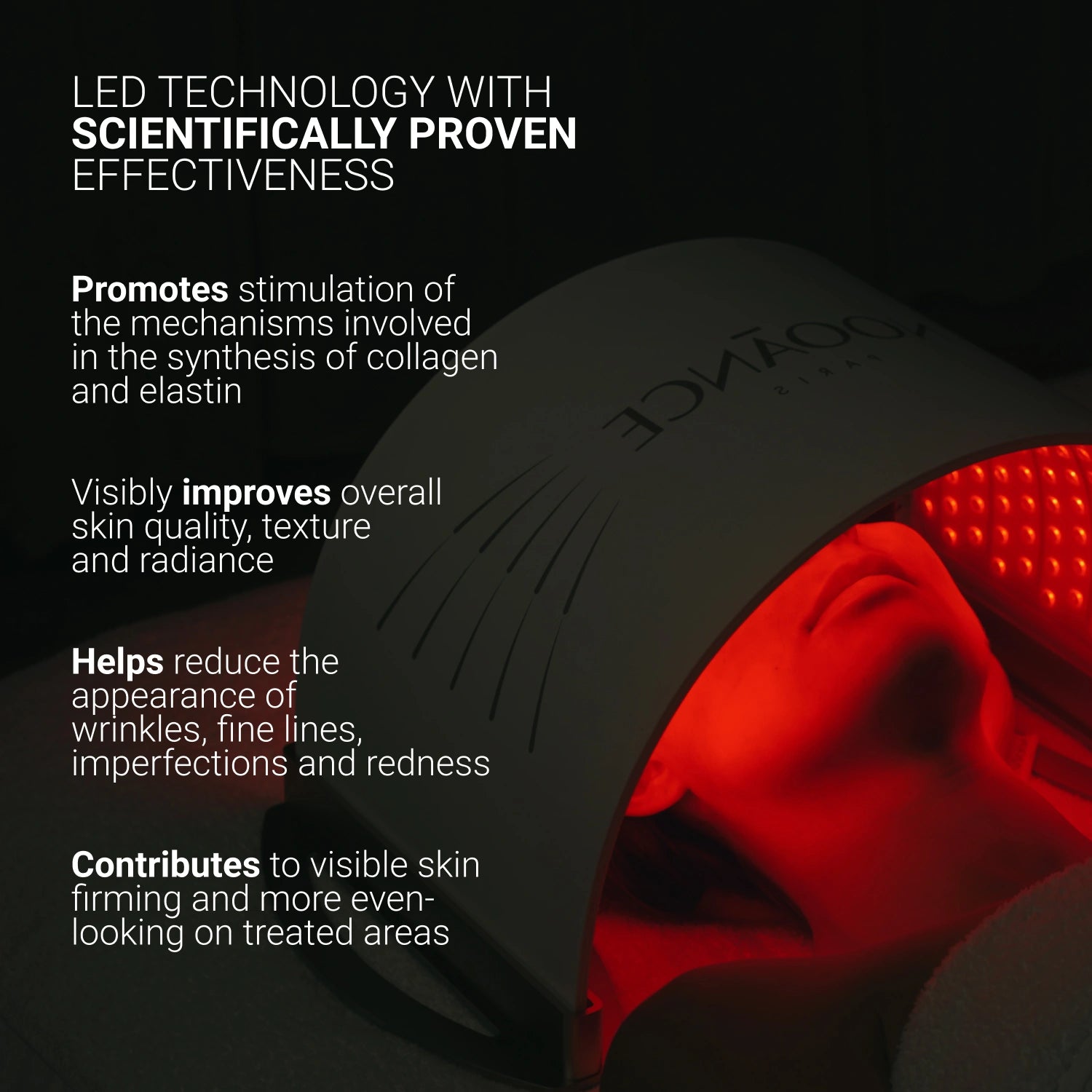 Equipped with 780 medical-grade LEDs with patented distribution, the FlexiDôme Pro uses wavelengths of 415 nm, 633 nm, and 830 nm, scientifically recognized unanimously for their benefits on the skin. With the highest density of LEDs per cm², it covers both the face and chest but also all other parts of the body. Each LED uses only two wavelengths, maximizing efficiency without dilution. A true 180° immersion.