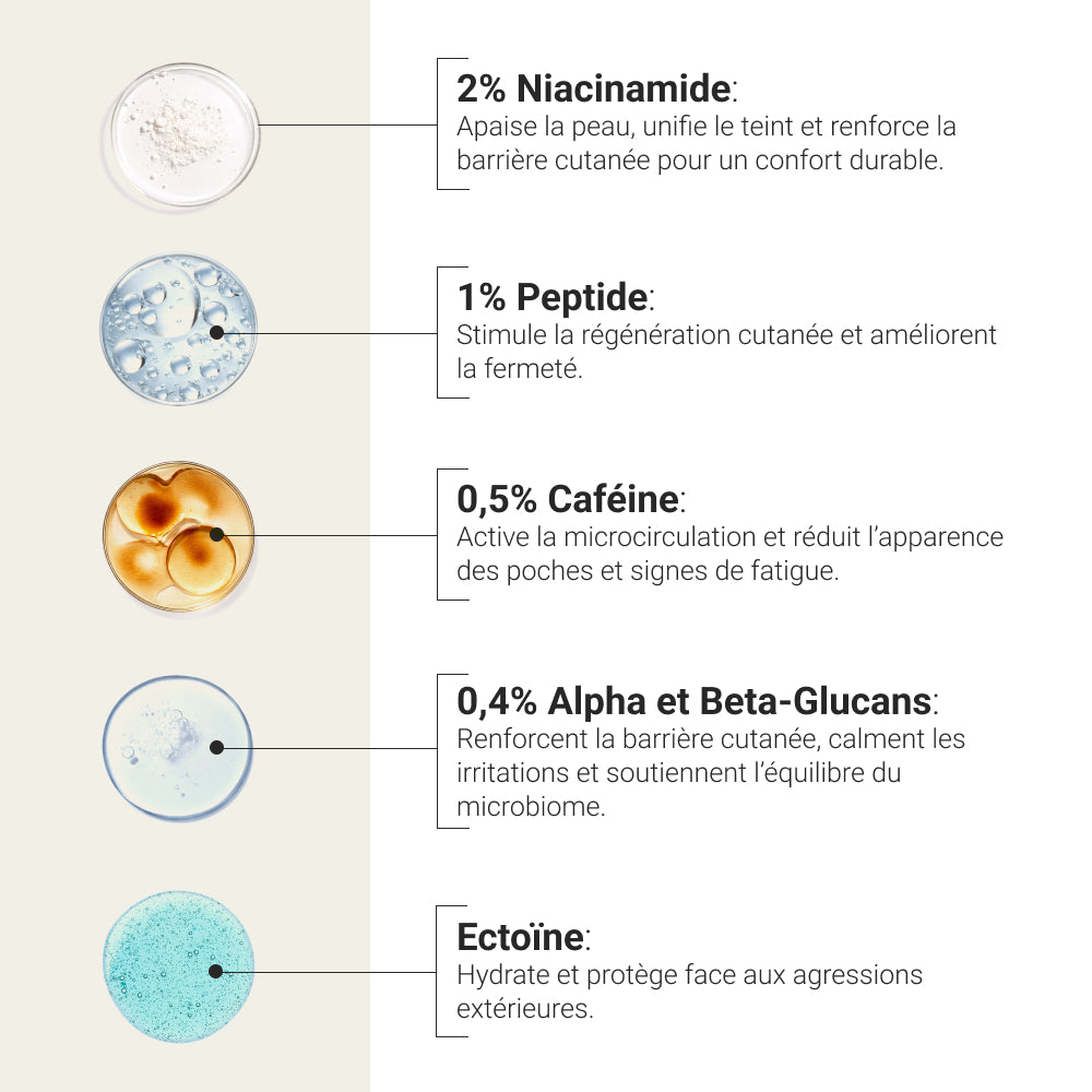 In conclusion, the ingredients contained in this eye contour treatment work in synergy to provide deep hydration, strengthen the skin barrier, and reduce the inflammation that causes dark circles and bags. It is a complete 360° treatment for all the problems encountered by the delicate skin around our eyes.