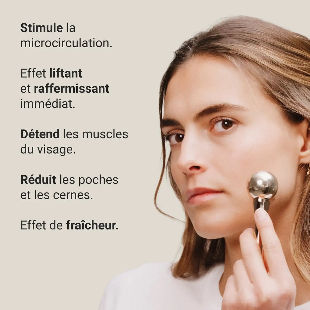 Sa surface XL diffuse le froid de manière homogène sur l'ensemble du visage et du cou. Dès les premiers passages, la peau paraît visiblement réveillée, les traits rafraîchis et le teint plus éclatant. Une sensation de fraîcheur immédiate pour bien commencer la journée.