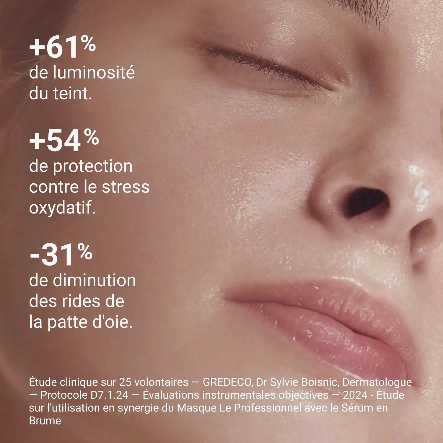 **Étude clinique sur 25 volontaires — Masque Le Professionnel utilisé conjointement avec le Sérum en Brume Éclat Lumière+ — GREDECO, Dr Sylvie Boisnic, Dermatologue — Protocole D7.1.24 — Évaluations instrumentales objectives — 2024. Les résultats peuvent varier selon les individus.