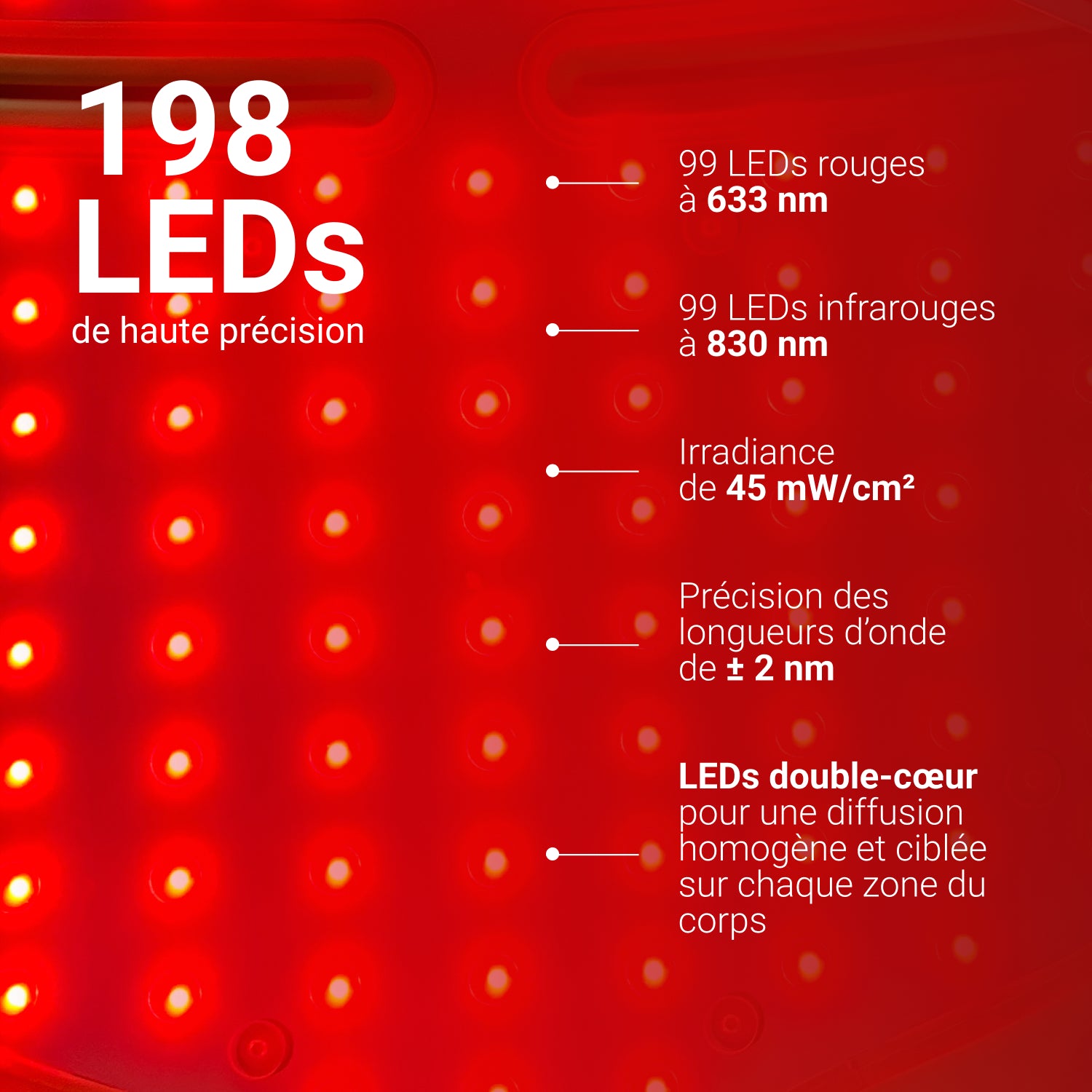 | Longueurs d'onde des LED | 633 nm +/-2 nm (Rouge) -- 99 LED rouges 830 nm (Infrarouge) -- 99 LED infrarouges |