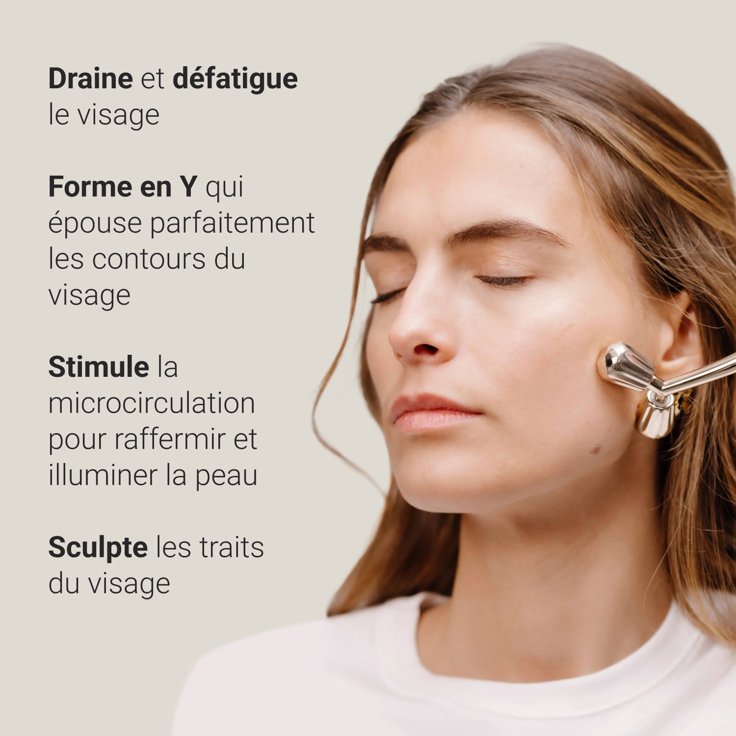 Progettato in lega color champagne naturalmente fredda, stimola la circolazione drenando e decongestionando il viso.