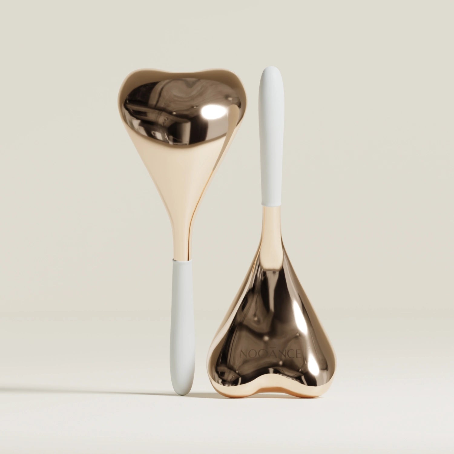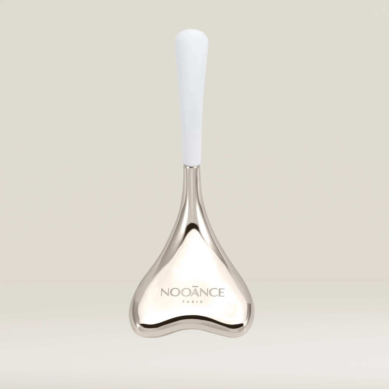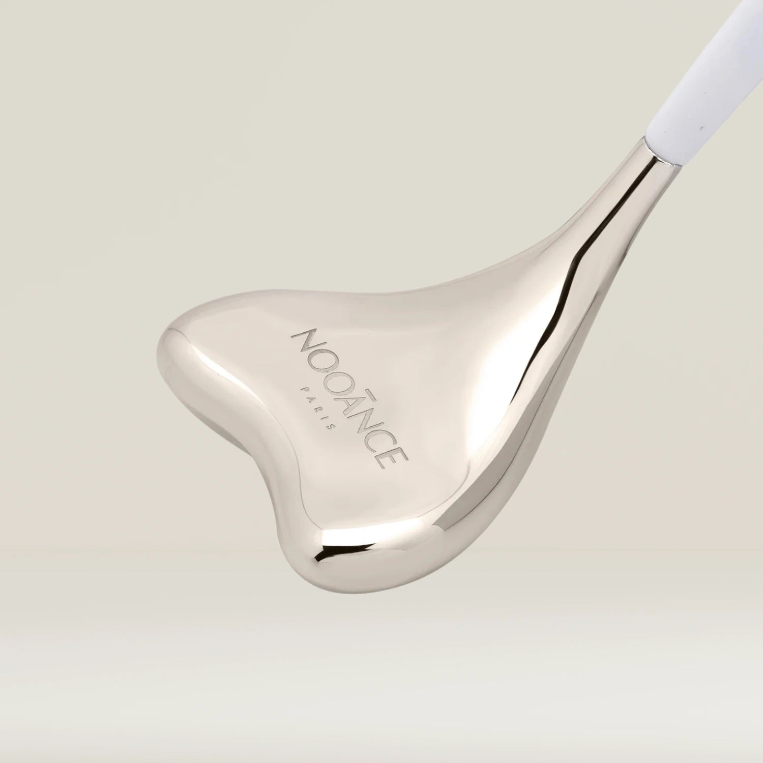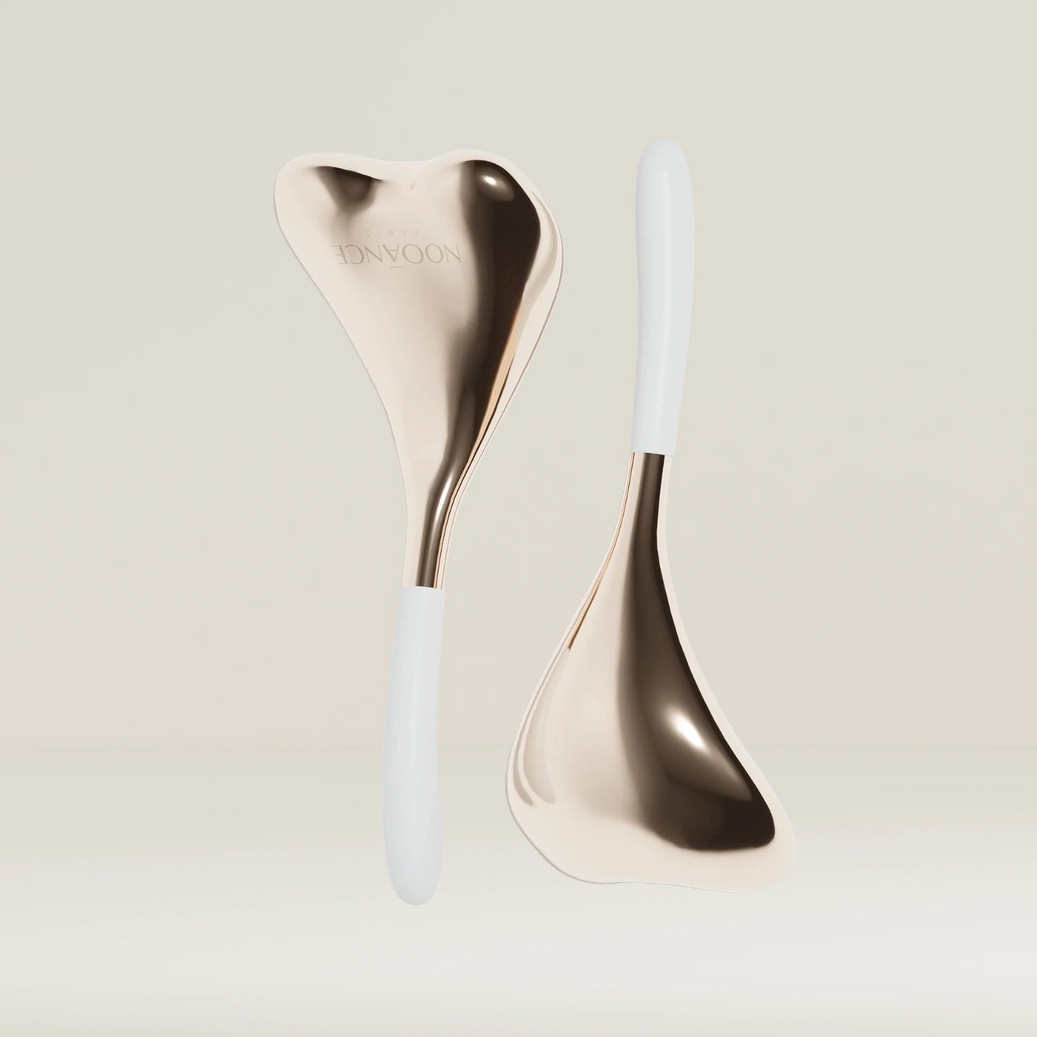 Sotto la linea della mascella: Posizionare i cucchiai al centro del collo, appena sotto la linea della mascella. Con un unico movimento, far scorrere i cucchiai dal centro verso l'esterno, verso la parte inferiore delle orecchie, quindi lungo il collo fino alle clavicole. Usare il lato arrotondato dei cucchiai.