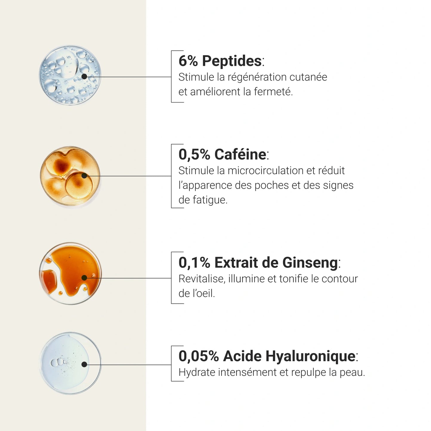 Réduit les poches, les cernes et l'hyperpigmentation sous les yeux