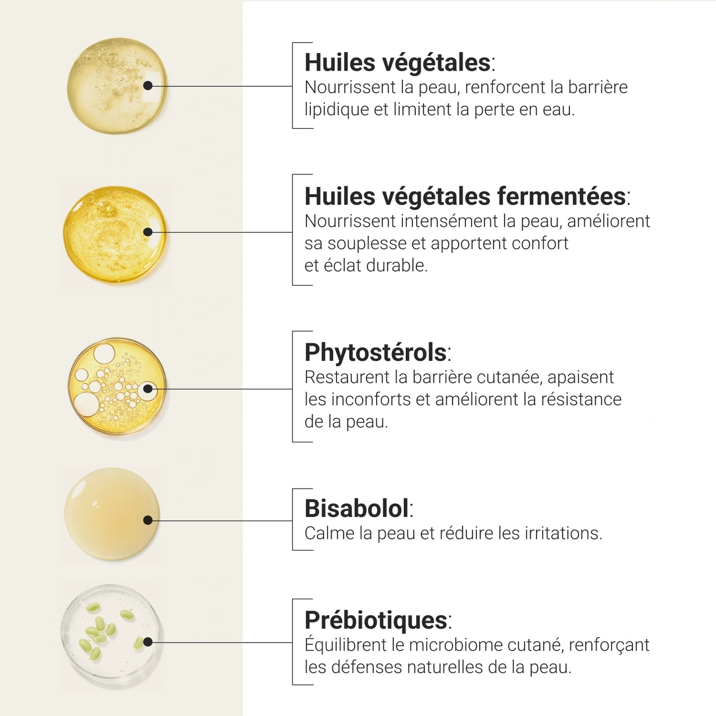 Pour renforcer la barrière cutanée, diminuer les irritations et protéger la peau face aux agressions, cette huile contient des lipides prébiotiques qui renforce également le microbiome cutané.