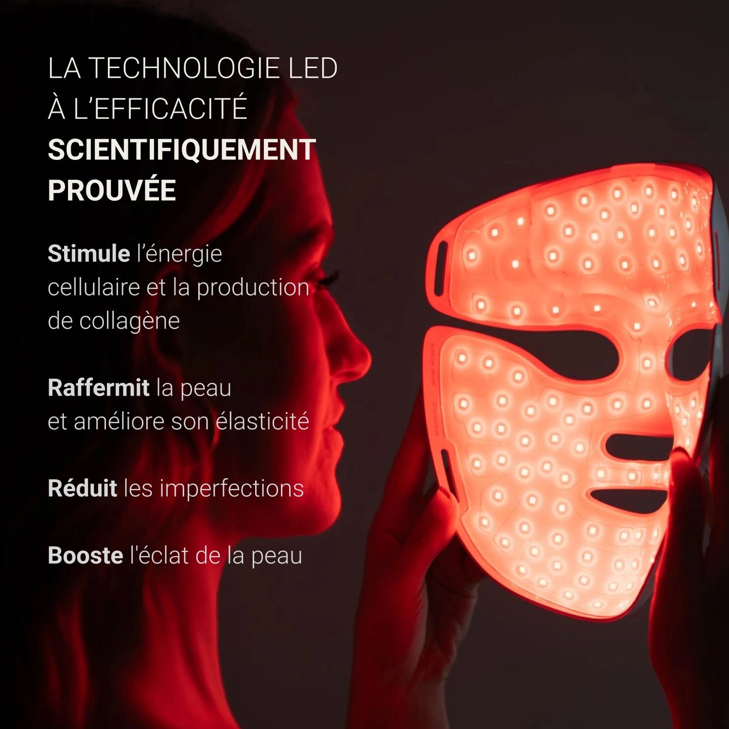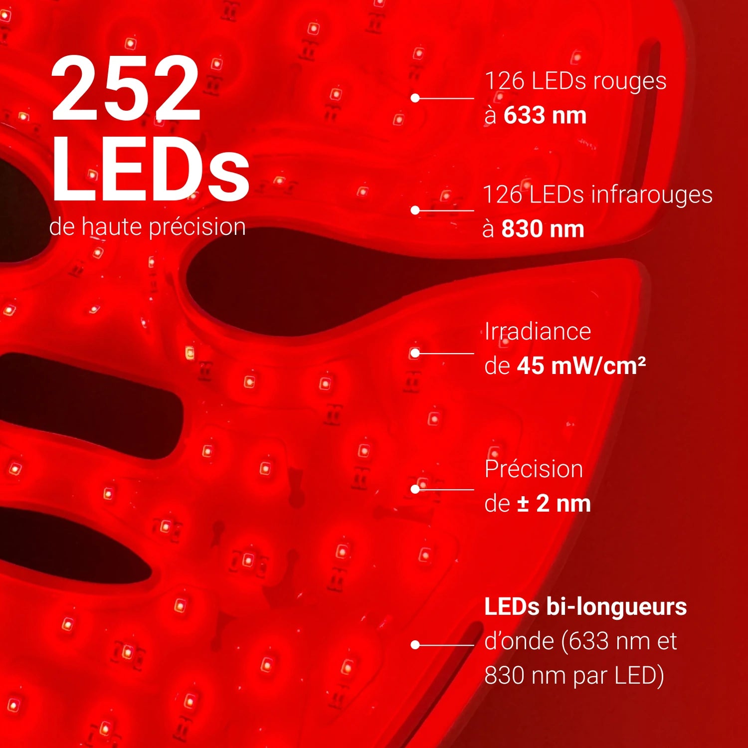 Équipé de 252 LEDs de qualité médicale à la répartition brevetée, utilisant les longueurs d'onde de 633 nm et 830 nm, reconnues scientifiquement de manière unanime pour leurs bienfaits sur la peau. Avec la plus haute densité de LEDs par cm², il cible précisément chaque zone du visage, y compris les zones sensibles comme le contour des yeux et la lèvre supérieure. Chaque LED utilise seulement deux longueurs d'onde, maximisant l’efficacité sans dilution.