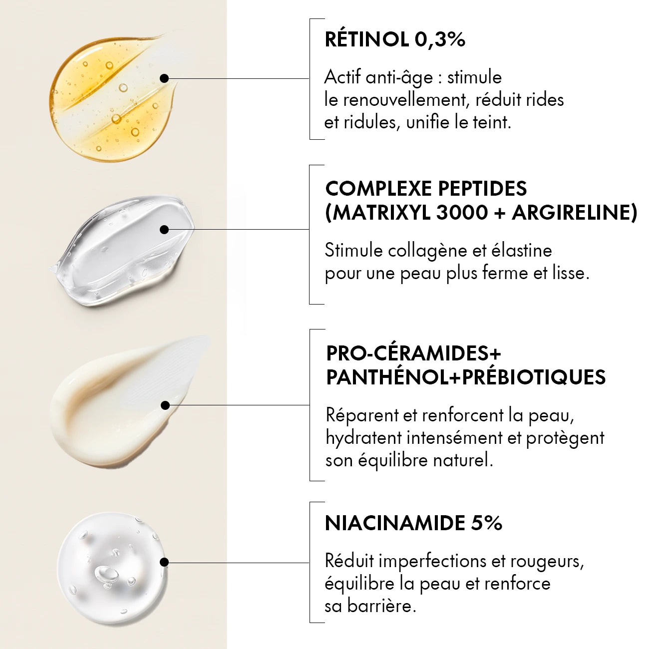 Enrichie de 0,3 % de Rétinol et d'un Complexe Peptides (Matrixyl 3000 et Argireline), cette formule cible simultanément les couches profondes et superficielles de la peau pour diminuer visiblement les signes de l'âge. Associé aux Pro-Céramides, ce soin protège la barrière cutanée et apaise les irritations pour une peau confortable.